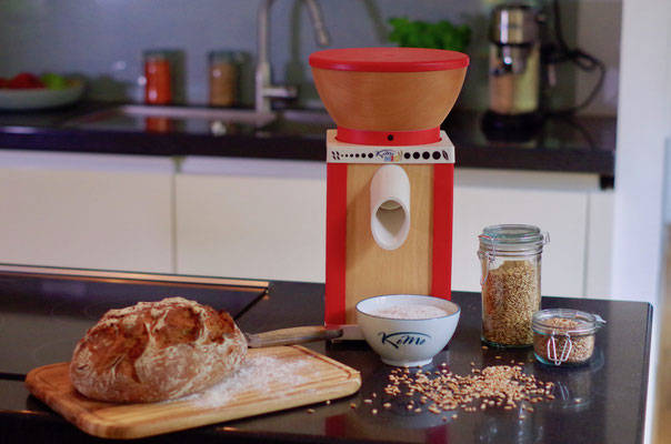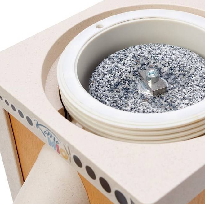 Kamenný mlýnek KoMoMio má velice jednoduchou obsluhu. Stačí jen zapnout mlýnek a nasypat suroviny do násypky s kapacitou 1200 gramů. Pootočením násypky doleva nebo doprava upravíte hrubost mletí. Můžete umlít mouku v jakékoli hrubosti od drceného obilí (tzv. lámanky) po hladkou dortovou mouku. Při mletí čočky, která je přirozeně mastnější, je možné začít mlít najemno a sledovat, jestli se mouka sype nebo ne. Pokud nesype, nebo po nějaké chvíli přestane, otočte násypkou na hrubší mletí.