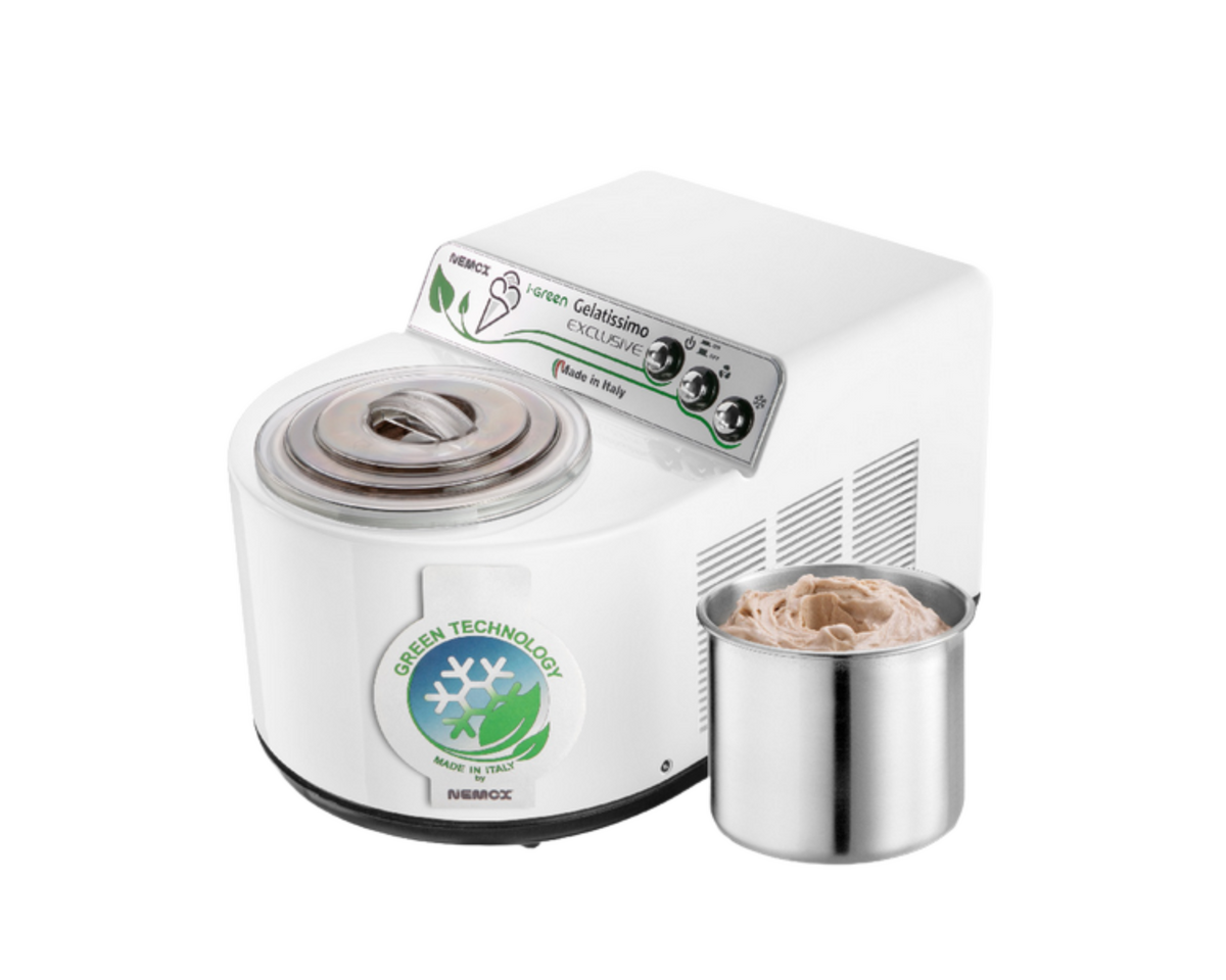 Gelatissimo Exclusive i-Green je takový domácí zmrzlinový stánek, ve kterém si opravdu připravíte zmrzlinu jako ze stánku! Během 15-20 minut vyrobí okolo 1 kg zmrzliny, gelata, sorbetu, granity nebo mraženého jogurtu. To je 10-20 porcí! Na výrobu můžete použít zmrzlinovou směs z obchodu a samozřejmě i vlastnoručně připravené směsi z čerstvých surovin (mléka, cukru, vaječných bílků, ořechů, čokolády, ovoce a mnoha dalších oblíbených ingrediencí). Součástí návodu k obsluze je 21 receptů na zmrzliny a sorbety a dva recepty na polevy (čokoládovou a malinovou).